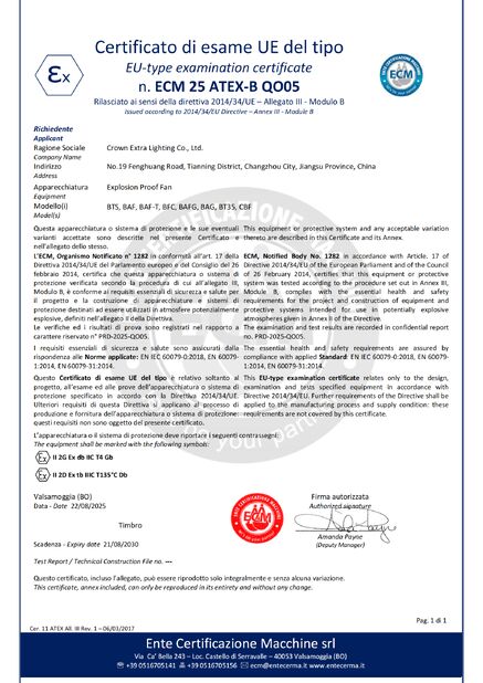 Çin Halk Cumhuriyeti'nin GB3836.1/ GB3836.2-2010 ulusal patlamaya dayanıklı standardına göre, şirket Ulusal Aydınlatma Kalite Denetim ve Denetim Merkezi'nin performans testini geçti ve patlamaya dayanıklı sertifika ve test raporunu aldı; akabinde, AB ATEX sertifikası, ISO9001:2008, RoHS sertifikası ve üretim lisansı gibi yönetim sistemi sertifikalarını almıştır. Şirket, gelişmiş üretim ekipmanları ve test ekipmanları ile donatılmıştır, kurumsal yönetim, ürün tasarımı, süreç kalite kontrolü ve geri bildirim için yönetim sistemine sıkı sıkıya bağlı olarak, yüksek nitelikli ve deneyimli bir Ar-Ge teknik ekibi ve yönetim ekibine sahiptir, etkin bir şekilde patlamaya dayanıklı LED aydınlatma ve hizmet kalitesi.